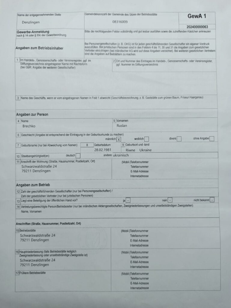 Ruslan arbeitet vollständig legal und lizenziert. Sein Unternehmen ist in Freiburg eingetragen und erfüllt alle deutschen Normen und Sicherheitsvorschriften.