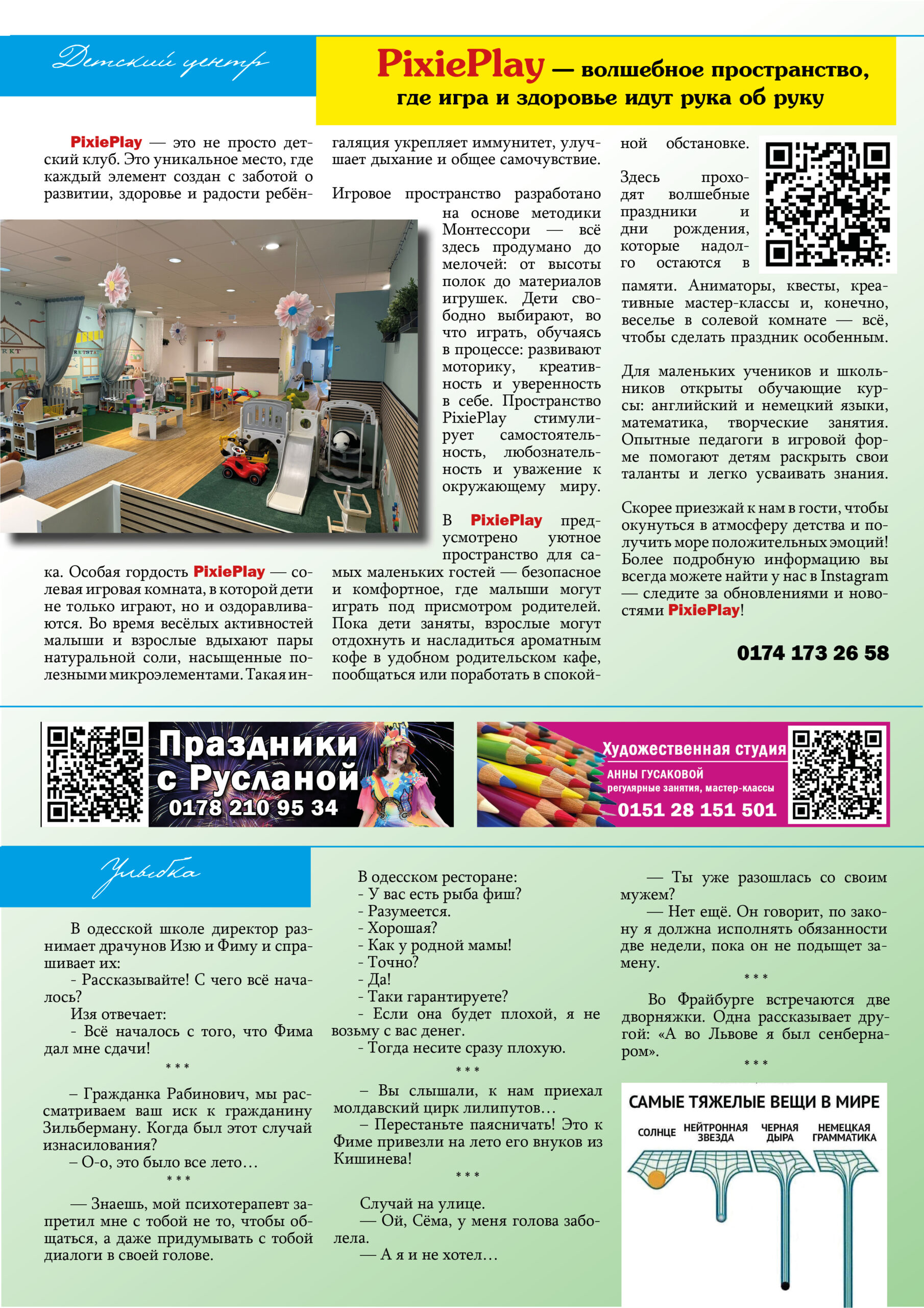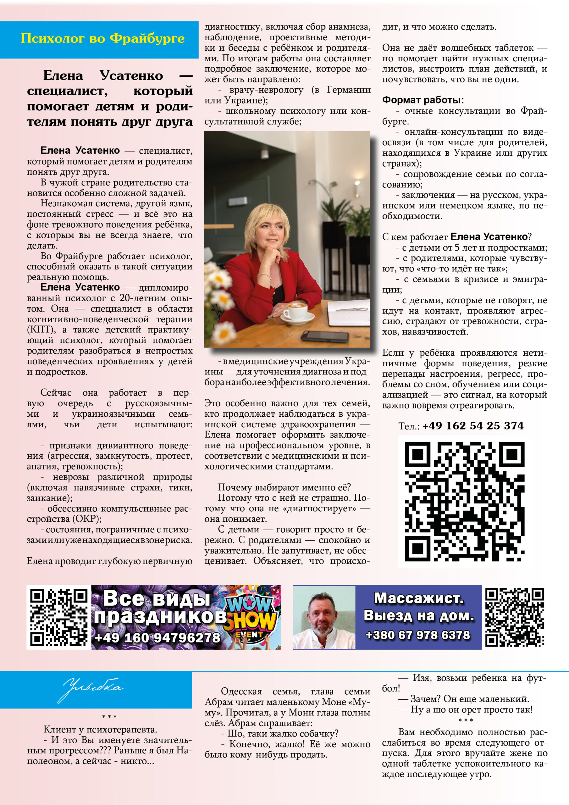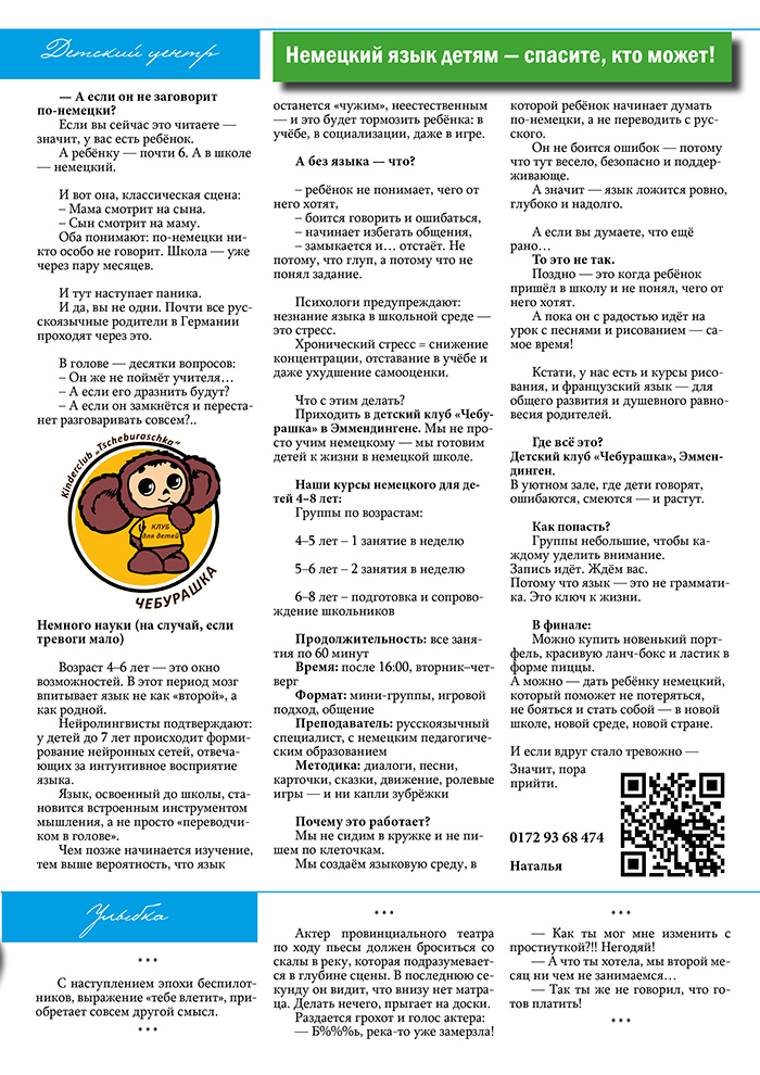 Мы объединяем активную, русскоязычную аудиторию — предпринимателей, родителей, специалистов и просто неравнодушных людей. Ваше объявление увидят те, кто действительно живёт здесь и сейчас — и готов пользоваться вашими услугами.