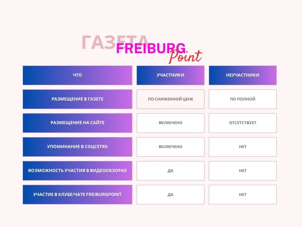 Вот ключевые преимущества размещения рекламы в газете «FreiburgPoint» для Вашего бизнеса: